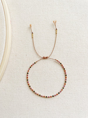 Our Fiesta Frenética Single Bracelets are made with a mix of different shapes and sizes of 14Kt gold filled beads strung in a silk cord.